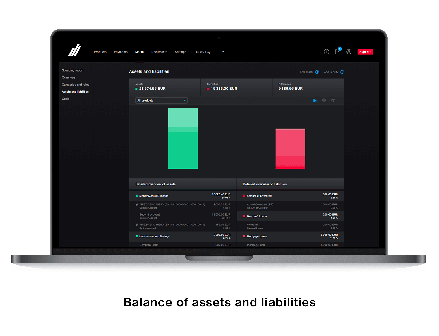 - A perfect overview of your finances and assets will help you get the Spending report and Asset Balance, which you will find in the MaFin tab. Here you can also define your financial goals.