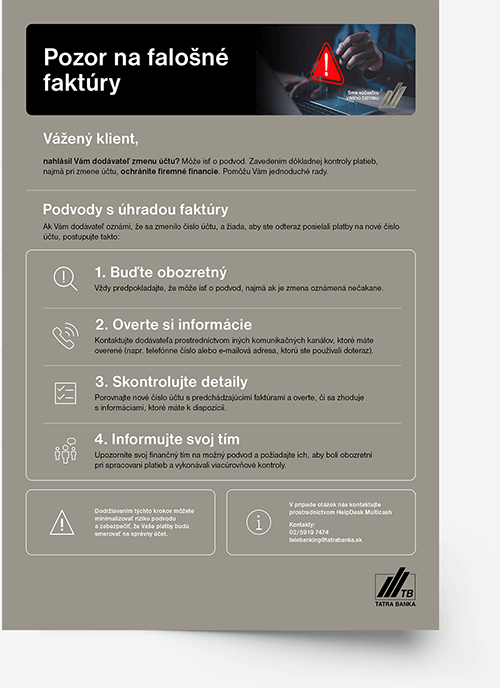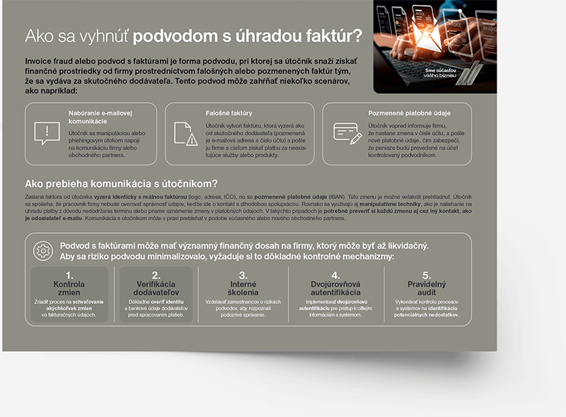 Vždy je potrebné dostatočne overiť akúkoľvek zmenu súvisiacu s platbou aj cez iný komunikačný kanál, ako je ten, z ktorého požiadavka prichádza. Odkazy alebo kontaktné údaje uvedené v e-maile alebo v liste so žiadosťou o zmenu môžu byť podvodné. Tie určite nie je vhodné používať.