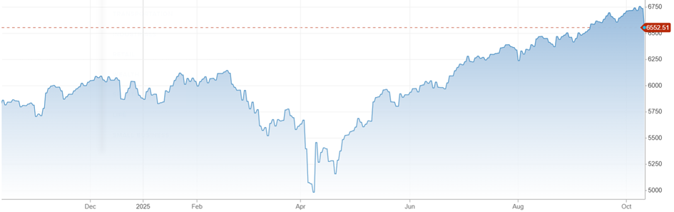 Zdroj: https://www.cnbc.com/quotes/.SPX?qsearchterm=s&p, dňa 10. 10. 2025