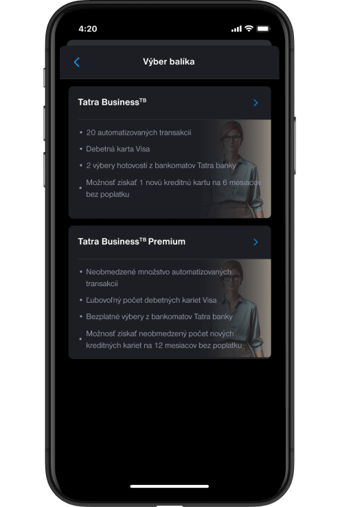 Podnikateľský účet Tatra BusinessTB Premium si otvoríte pohodlne cez mobilnú aplikáciu Tatra banka alebo aj v ktorejkoľvek pobočke Tatra banky. Pri online otvorení účtu zvoľte možnosť: Podnikateľský účetTB.